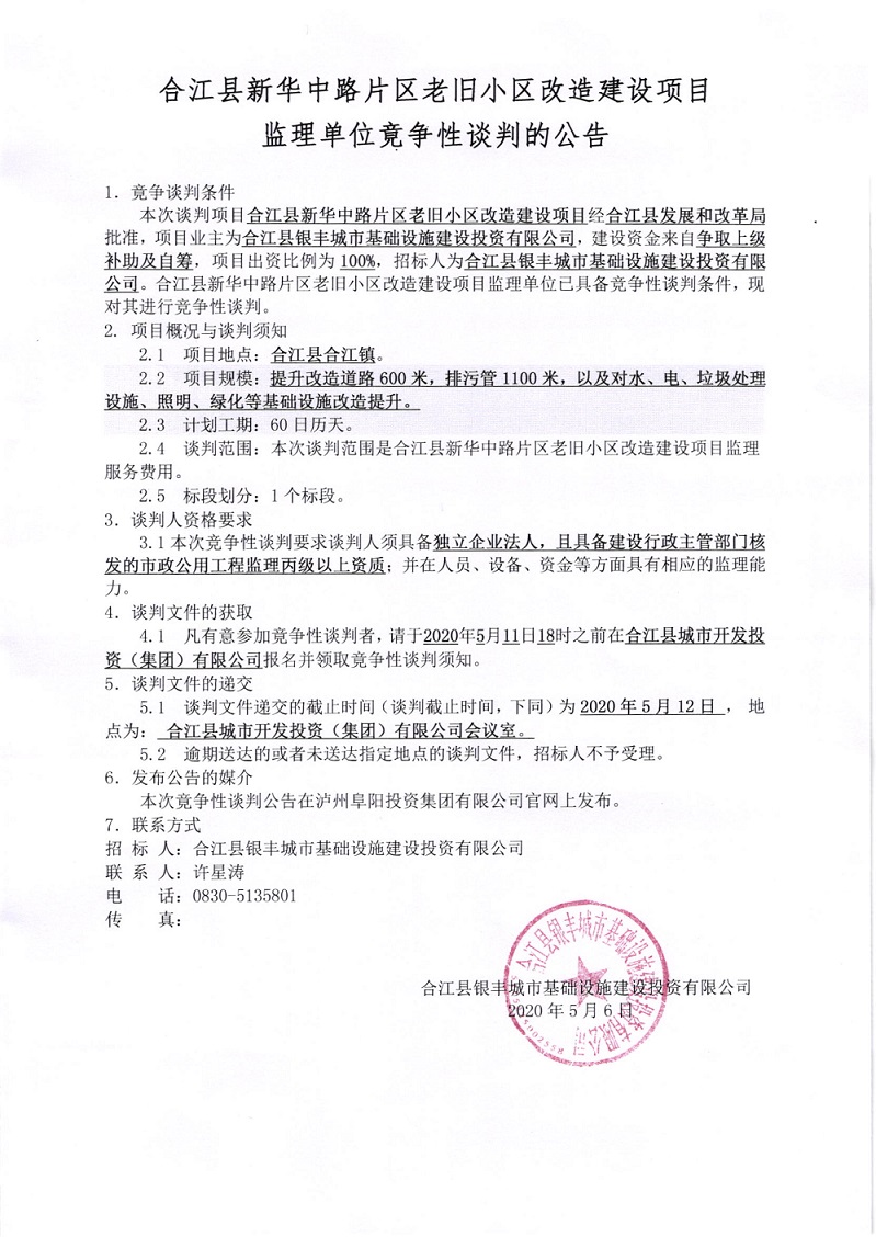 合江縣新華中路片區(qū)老舊小區(qū)改造建設(shè)項(xiàng)目監(jiān)理單位競爭性談判的公告