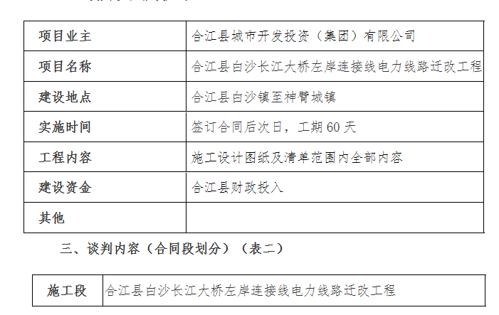 一、 本次談判項(xiàng)目為合江縣白沙長(zhǎng)江大橋左岸連接線電力線路遷改工 程, 現(xiàn)通過(guò)競(jìng)爭(zhēng)性談判方式選擇和確定承包人, 誠(chéng)邀符合資格條件的 潛在申請(qǐng)人參與本項(xiàng)目的競(jìng)爭(zhēng)性談判。