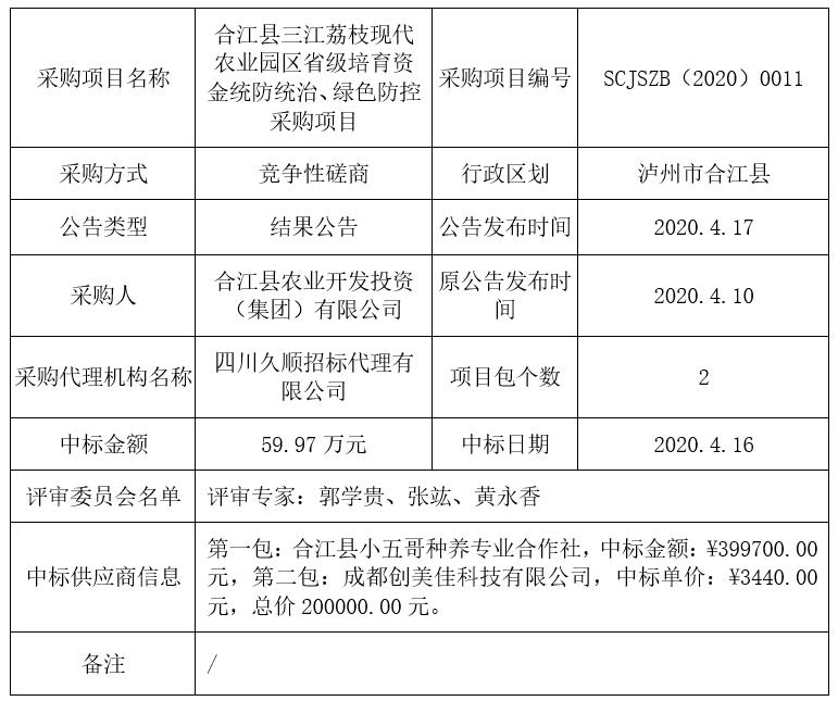 合江縣三江荔枝現(xiàn)代農(nóng)業(yè)園區(qū)省級(jí)培育資金統(tǒng)防統(tǒng)治、綠色防控采購項(xiàng)目競(jìng)爭性磋商結(jié)果公告