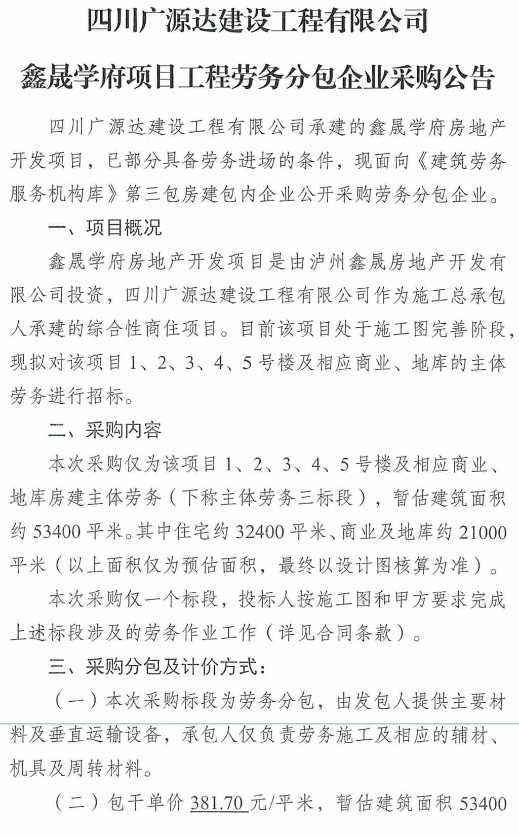 四川廣源達(dá)建設(shè)工程有限公司鑫晟學(xué)府項(xiàng)目工程勞務(wù)分包企業(yè)采購(gòu)公告